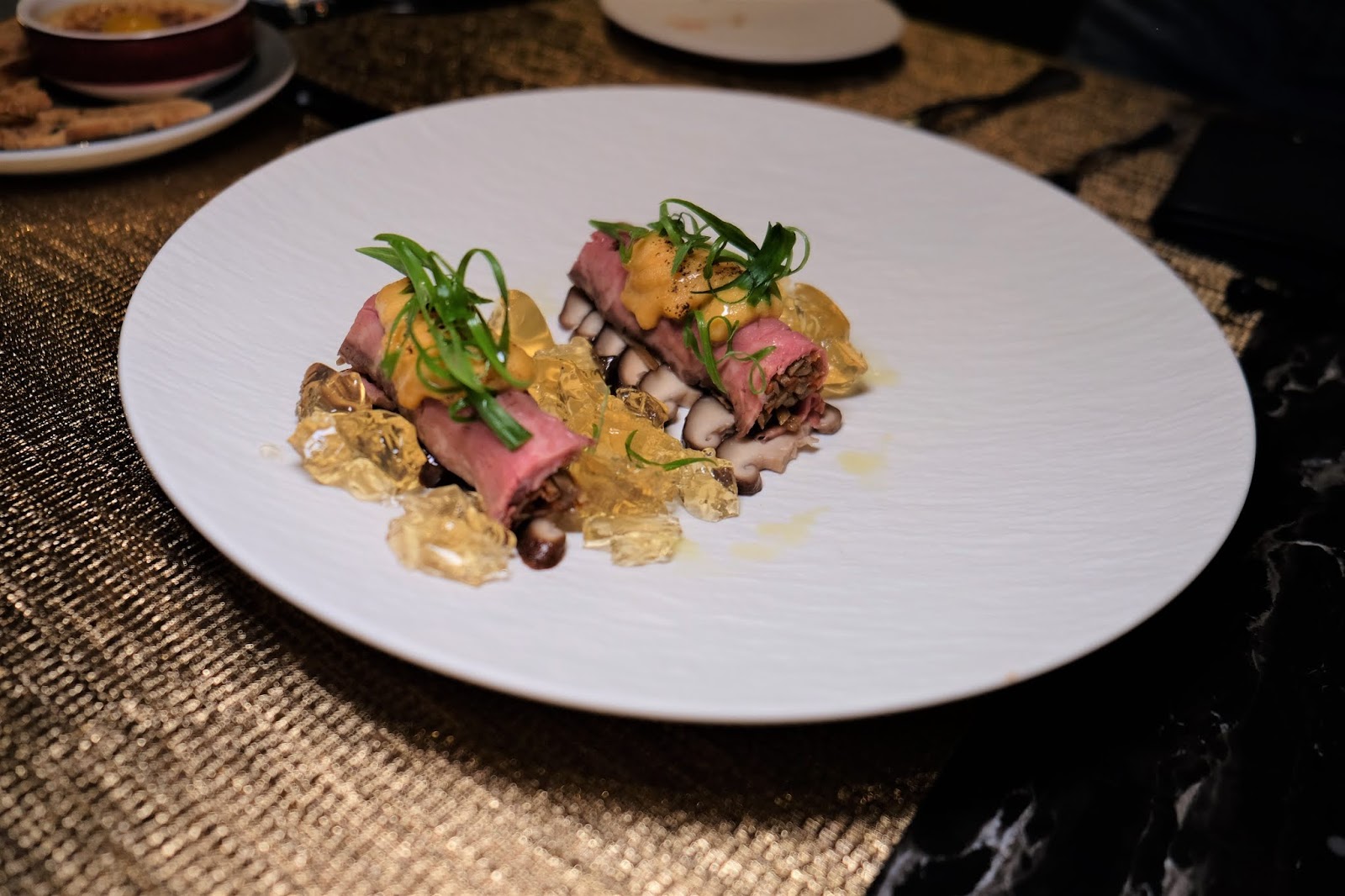 絕對是花心思之作,慢煮和牛肉質軟稔,卷住牛蒡及蘿蔔絲,令口應複雜多層次,蘸點一下海膽汁,味道令人回味,伴碟的牛清湯jelly,聽說用上7小時煮成,誠意十足。