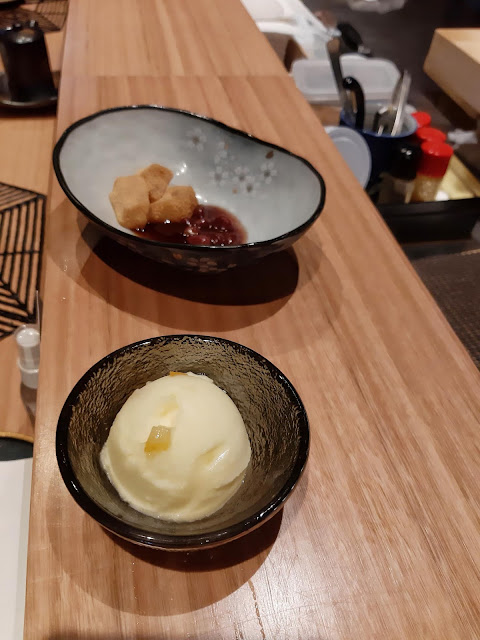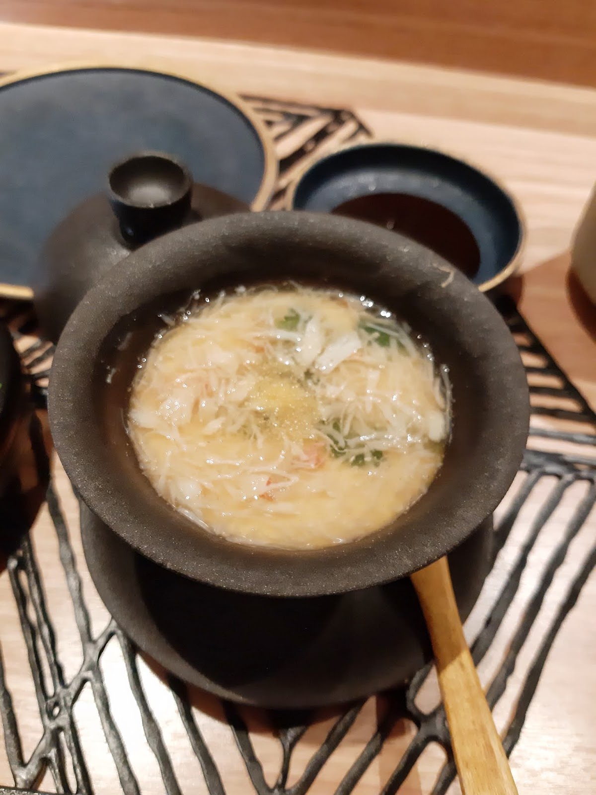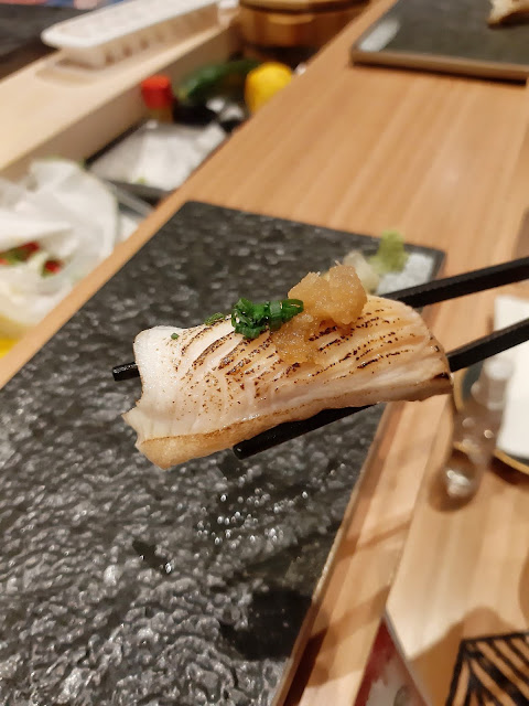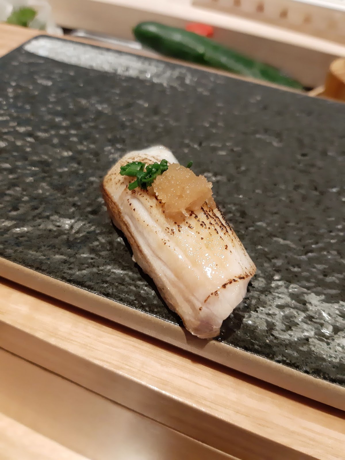 用火槍炙過的北海道銀鱈魚,逼出了油份,而且傳來陣陣焦香,放上酸汁蘿蔔蓉及蔥花,起了平衡的作用,滿口都是滋味。