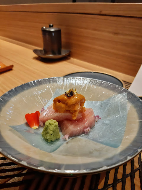 拖羅與馬糞海膽的組合,絕對是令人心動,入口豐腴甜美,尤其是海膽在舌尖上慢慢溶化的感覺真美妙。