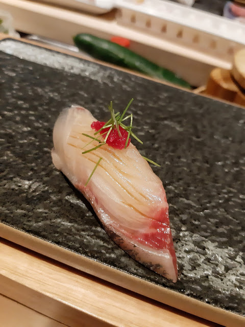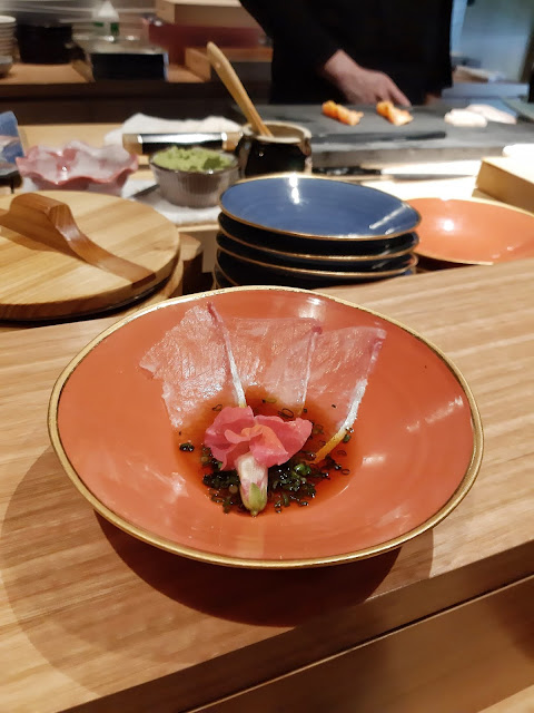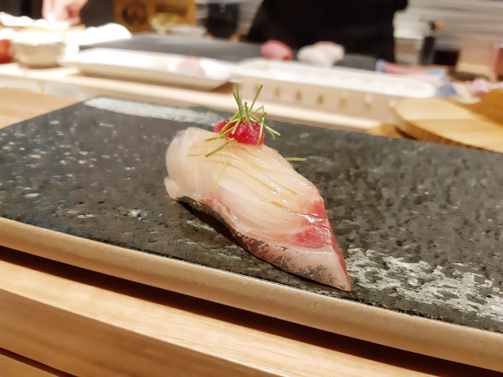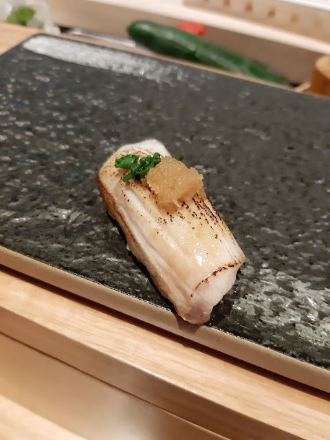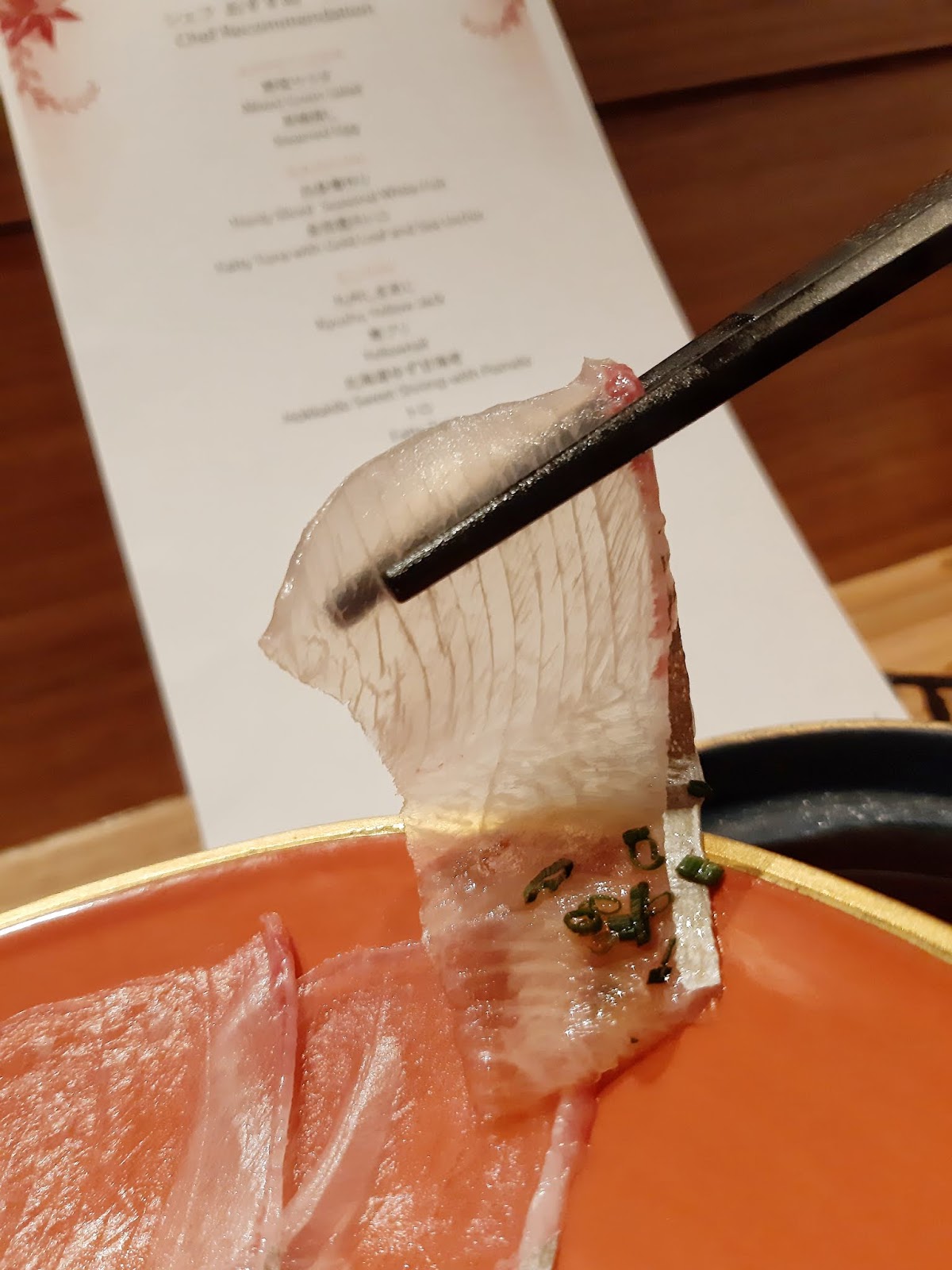 開始踏入主題,先由白身魚起動,平政魚薄切配以酸汁蔥花,清爽帶微酸,正好挑起了食慾。