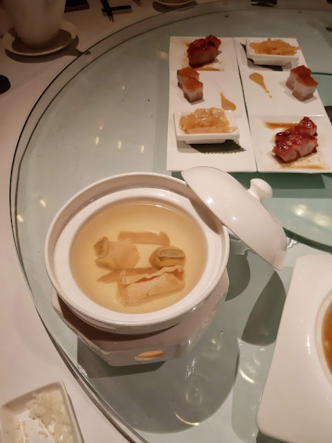 湯水以保溫器皿奉上,揭開一刻,陣陣松茸幽香隨之而來,舀一下,非常足料而又湯色清澈,入口甘甜醇厚,火喉十足。