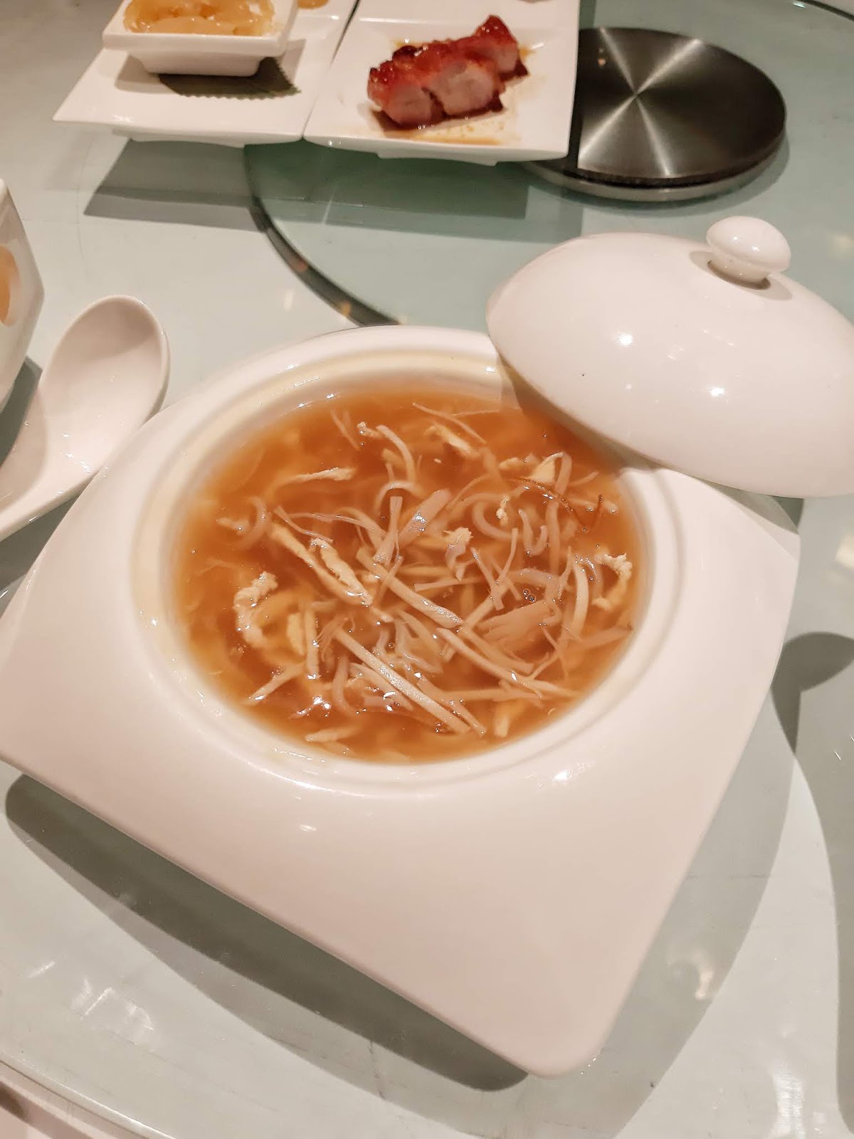 湯水以保溫器皿奉上,揭開一刻,陣陣松茸幽香隨之而來,舀一下,非常足料而又湯色清澈,入口甘甜醇厚,火喉十足。