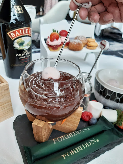 一set過上檯,非常吸睛,加入了Baileys朱古力醬,以蠋檯保溫,而哈根大師雪糕有香草及草莓各兩小球,而且用乾冰維持低溫狀態,就算放得耐都不怕溶化,好窩心的設計,用小鐵叉把雪糕戳起放入朱古力醬內打滾,沾上了朱古力醬的雪糕,正是冷熱夾雜的口感,非常誘人。