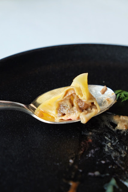 雲吞皮搓得柔韌而富彈性,入口有點al dente的感覺,餡料是牛肝菌作主打,陣陣幽香隨之而來,雲吞麵放上幾絲伊比利亞黑毛豬火腿,少許咸香,帶出了味覺的層次感,蘸點一下醬汁,帶出了甜美,實在相當吸引。