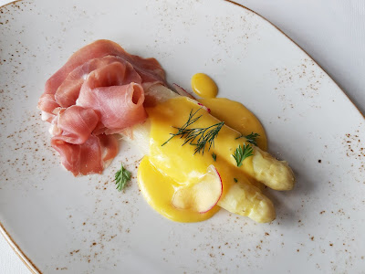 前菜已經是主角,白露筍實在是超大條,足有手掌的長度,以簡單的烚煮方式處理,更能突顯白露筍的鮮嫩及細緻,入口juicy,口感尤佳,配合荷蘭汁的甜美,真是上天賜給大家的美妙食材,此刻,就連巴馬火腿都給搶去了光芒。
