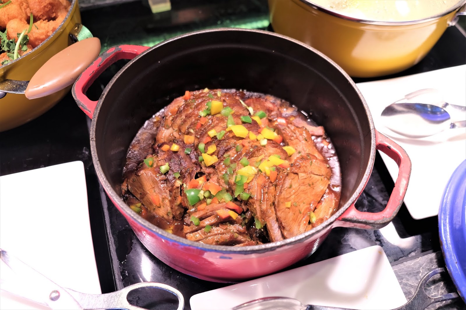 加上宮保雞丁、酥炸海鮮、香草烤羊髀、香芒炭燒排骨、白灼蝦及忌廉雜椒蘑菇意粉,熱葷的種類不算多,但好合胃口。