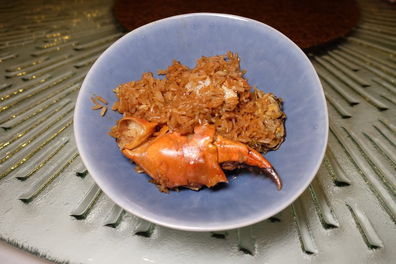 單尾是近似台式紅蟳米糕風味的「醬油糯米蒸肉蟹」,選用泰國糯米不單有嚼口,而且蟹汁都滲入糯米內,惹味得不得了,這道台灣人喜宴中常見的菜色,無疑帶來少許苦中作樂的感覺。