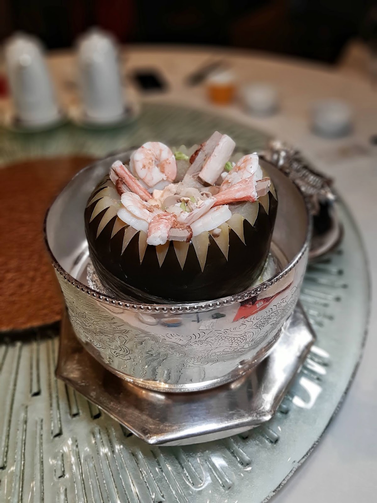 湯品是看似普通的「海皇冬瓜盅」,實質是誇張到一個點,因為材料把冬瓜盅完美蓋過,蟹柳、蝦仁、竹笙、火鴨絲、帶子及蓮子少不了,更有冬瓜盅不可少的夜香花,清心消暑,果真是夏日最住湯水。