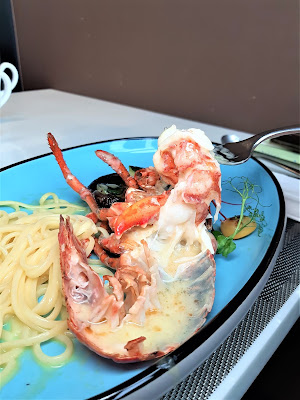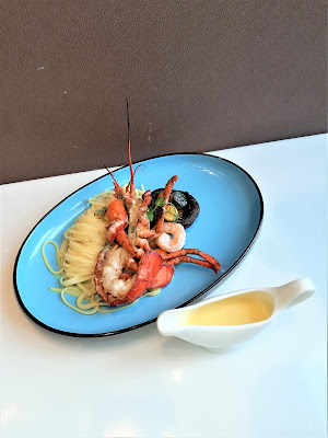 另一款「焗波士頓龍蝦(半邊)配檸檬牛油汁及紅花海鮮扁意粉」,今次有點不同,扁意粉配上檸檬牛油汁相對地夾得多,龍蝦依然出色,但可能自己挑剔,意粉咬落嚼勁還可以更好。