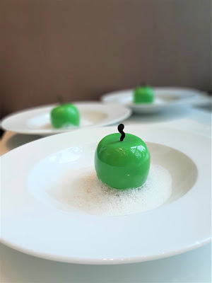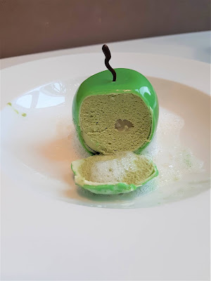 壓軸的甜品是「抹茶慕斯青蘋果醬泡沫」,想不到有點驚喜,賣相簡潔亮麗,驟眼睇真係好似一隻青蘋果,切開原來是抹茶慕斯,內裡更夾雜了青蘋果醬,酸酸地正好平衡了甜膩的口感,好味。