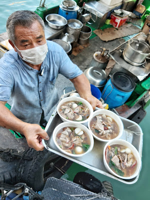 只見「流叔」把船準確地泊在漁船旁邊,煮好河粉後,依次放上鴨肉、魚蛋、豬耳及雞腎,再澆上熱燙的鴨湯。