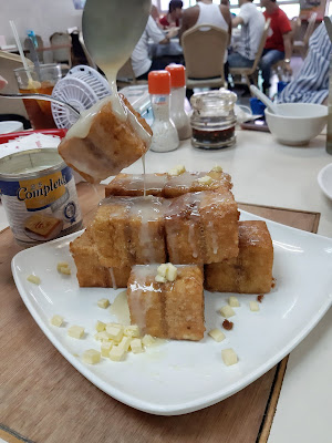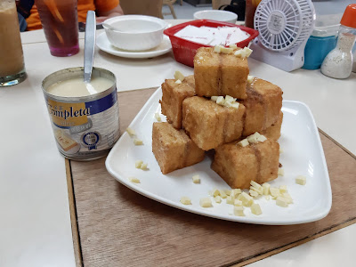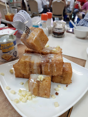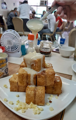 西多士切成方塊,夾層塗上花生醬,蘸上蛋漿後再炸,本身已非常香口,師傅再把牛油切碎灑上,好讓熱力把牛油溶化,最後是澆上鍊奶而不是常見的糖漿,不過為求影相靚,膽粗粗要求自己郁手,效果果然好好多。