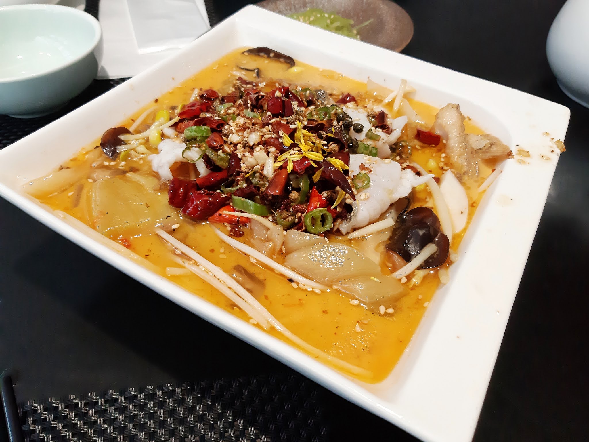 至於主菜先有「紅花水煮魚」或「老壇酸菜魚」(桂花魚或海沙巴)二選一,C小姐之前試過水煮魚,今次就轉點酸菜沙巴魚。