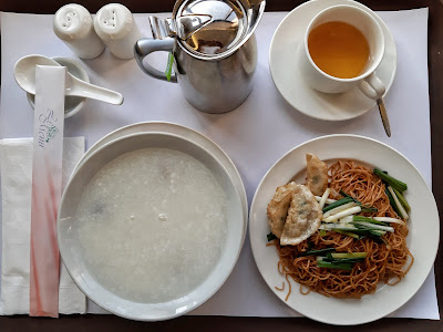 而中式是皮蛋瘦肉粥、炒麵及餃子,質素不錯,就連胡椒粉瓶都放上,幾細心下。