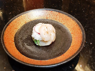 至於太太就最鍾意帆立貝壽司,一般處理手法是把飯團放下帆立貝之下,廚師卻把帆立貝割開,而把飯團藏身於內,咬落先是軟綿,再來是飯團的嚼口,效果不俗。