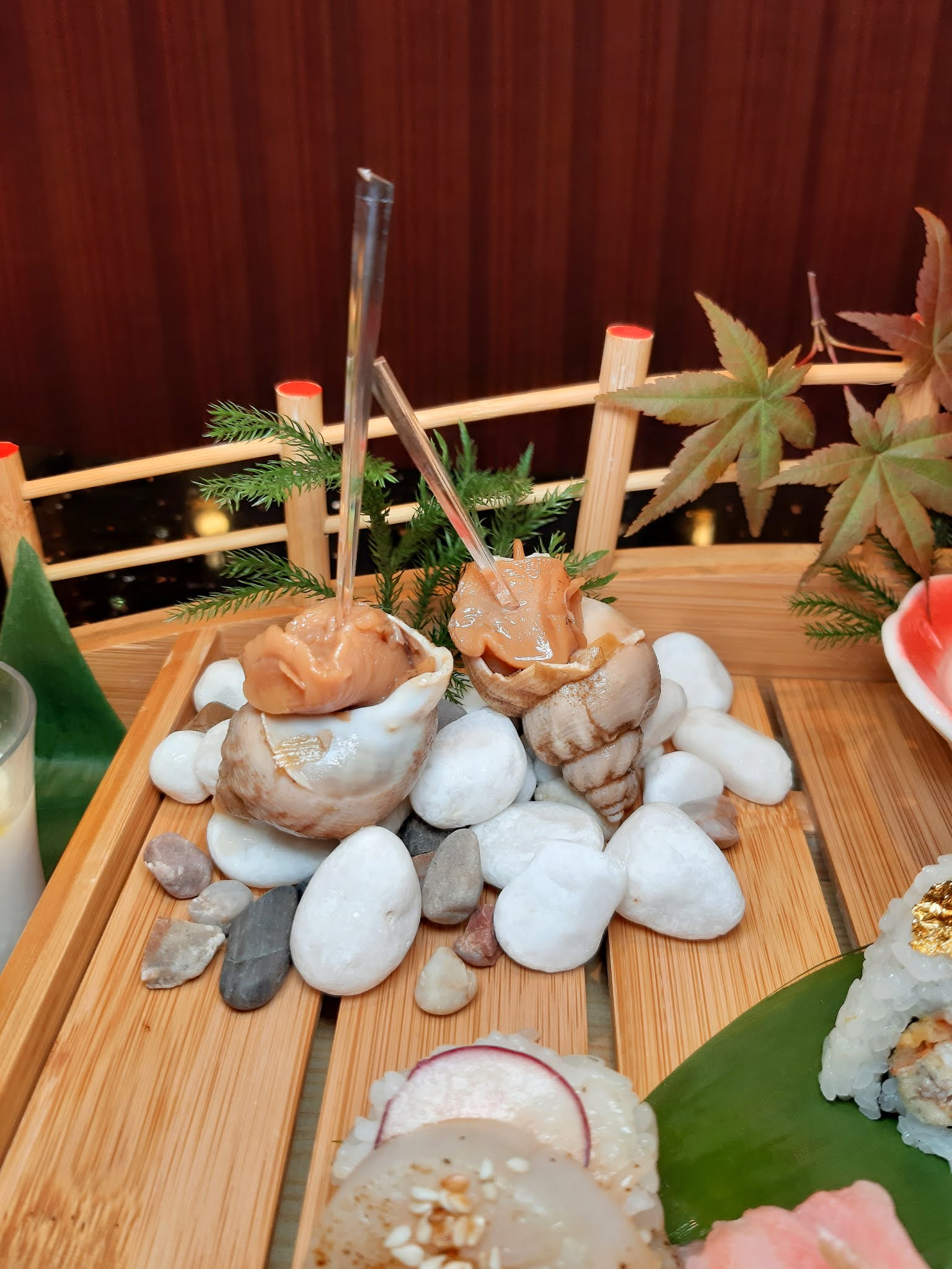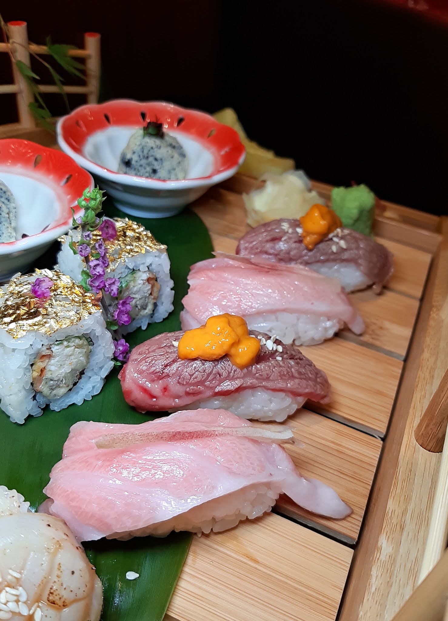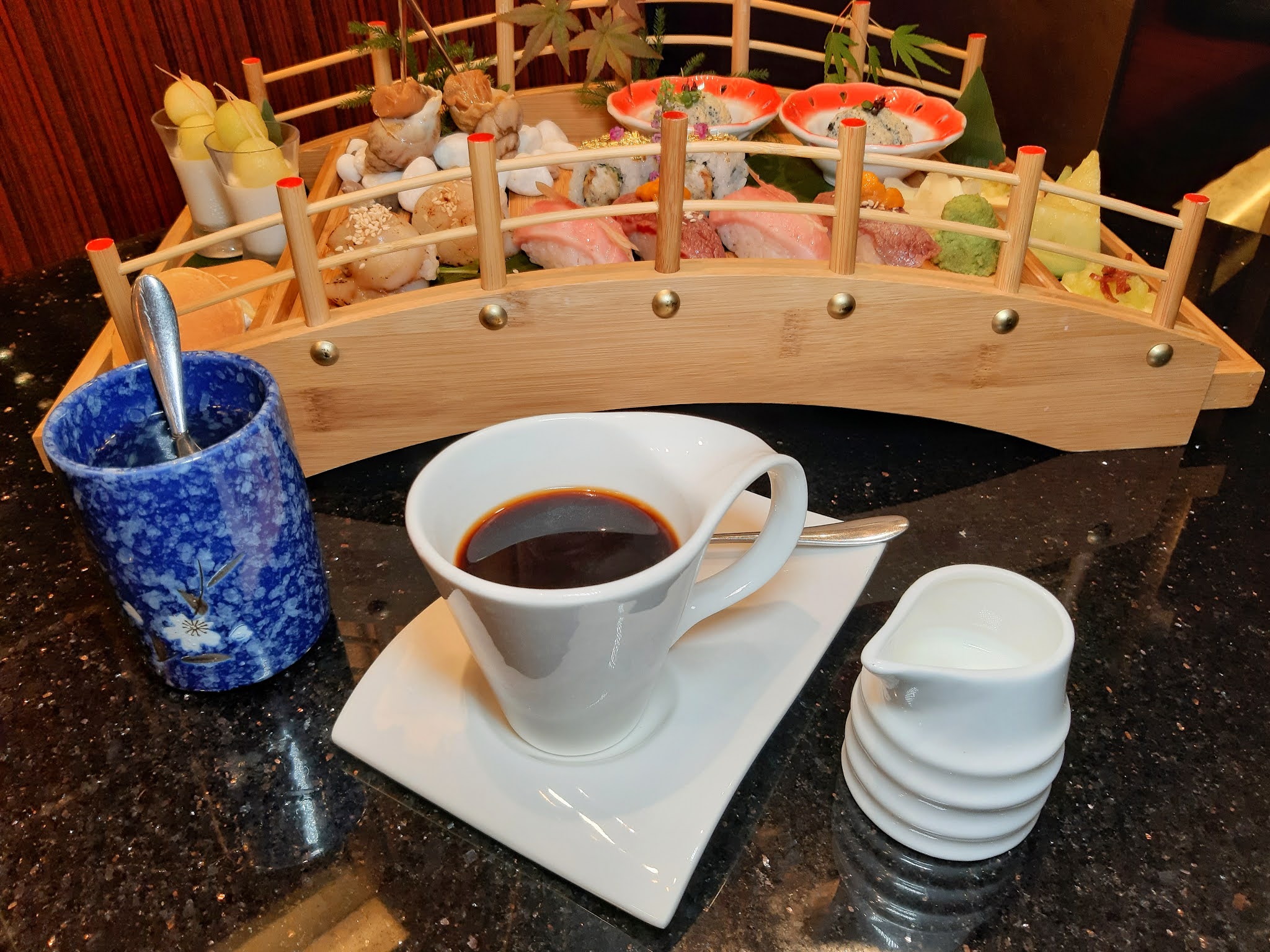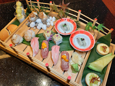 大大小小共20件壽司及甜點,以充滿和風的木橋送上,而不是常見的三層架。