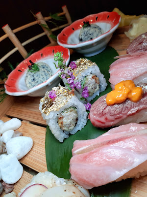 捏得緊密,放上了金箔倍覺矜貴,中間是脆中帶軟的軟殼蟹,好味。