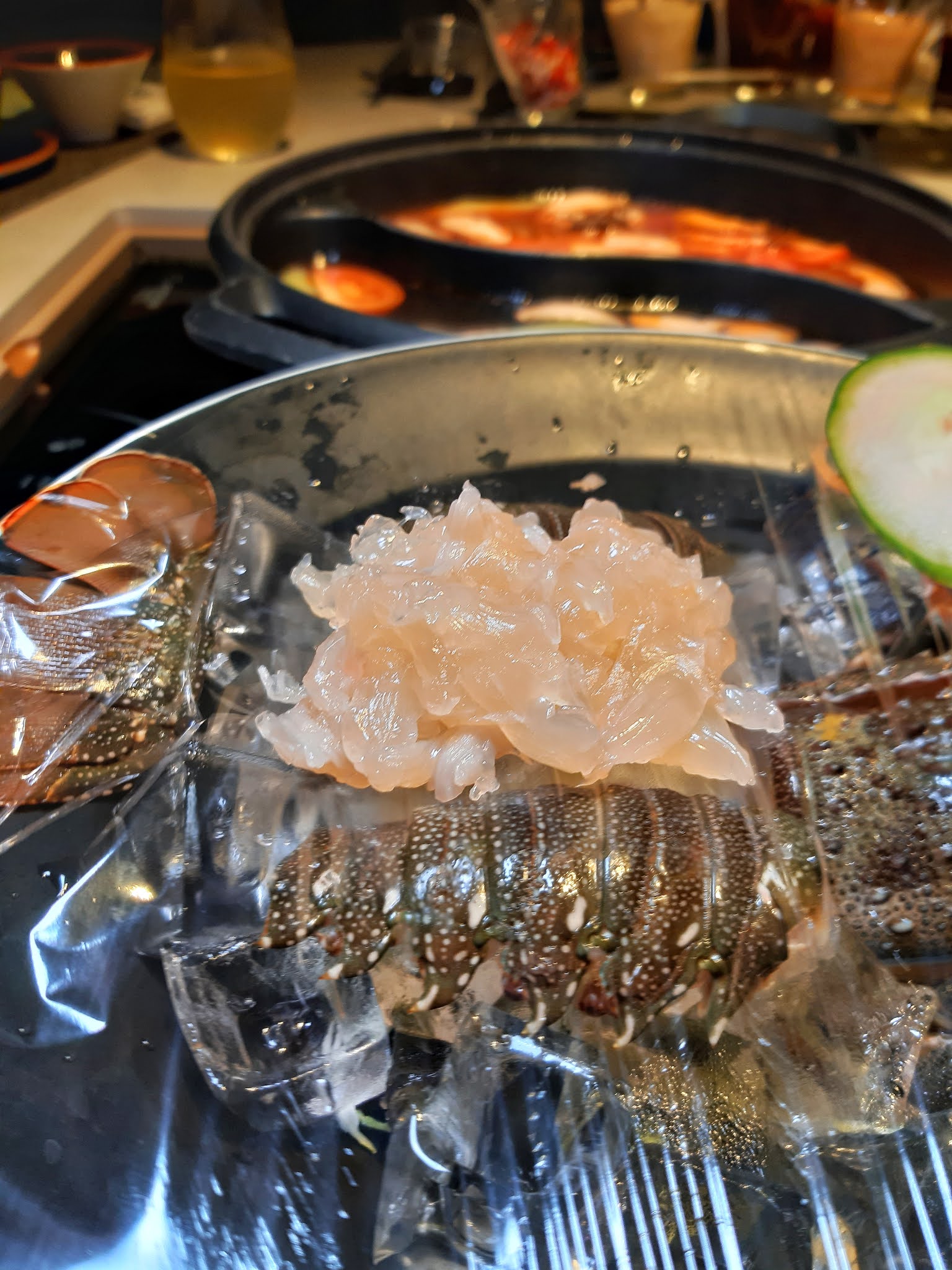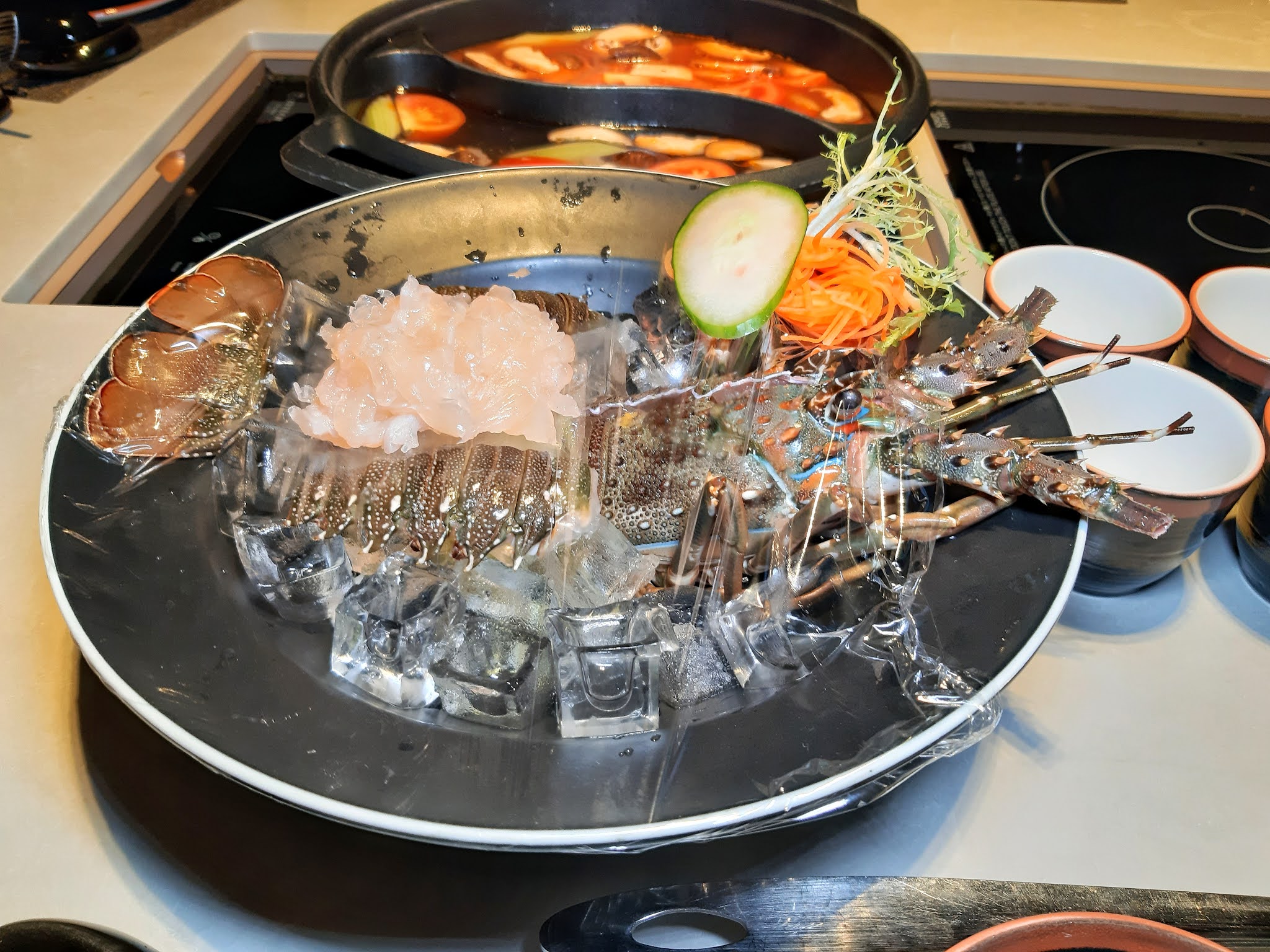 男女們就是龍蝦套餐,原隻龍蝦起肉當刺身又得,作為火鍋料都無問題,龍蝦頭放埋落湯底,龍蝦味道更濃。