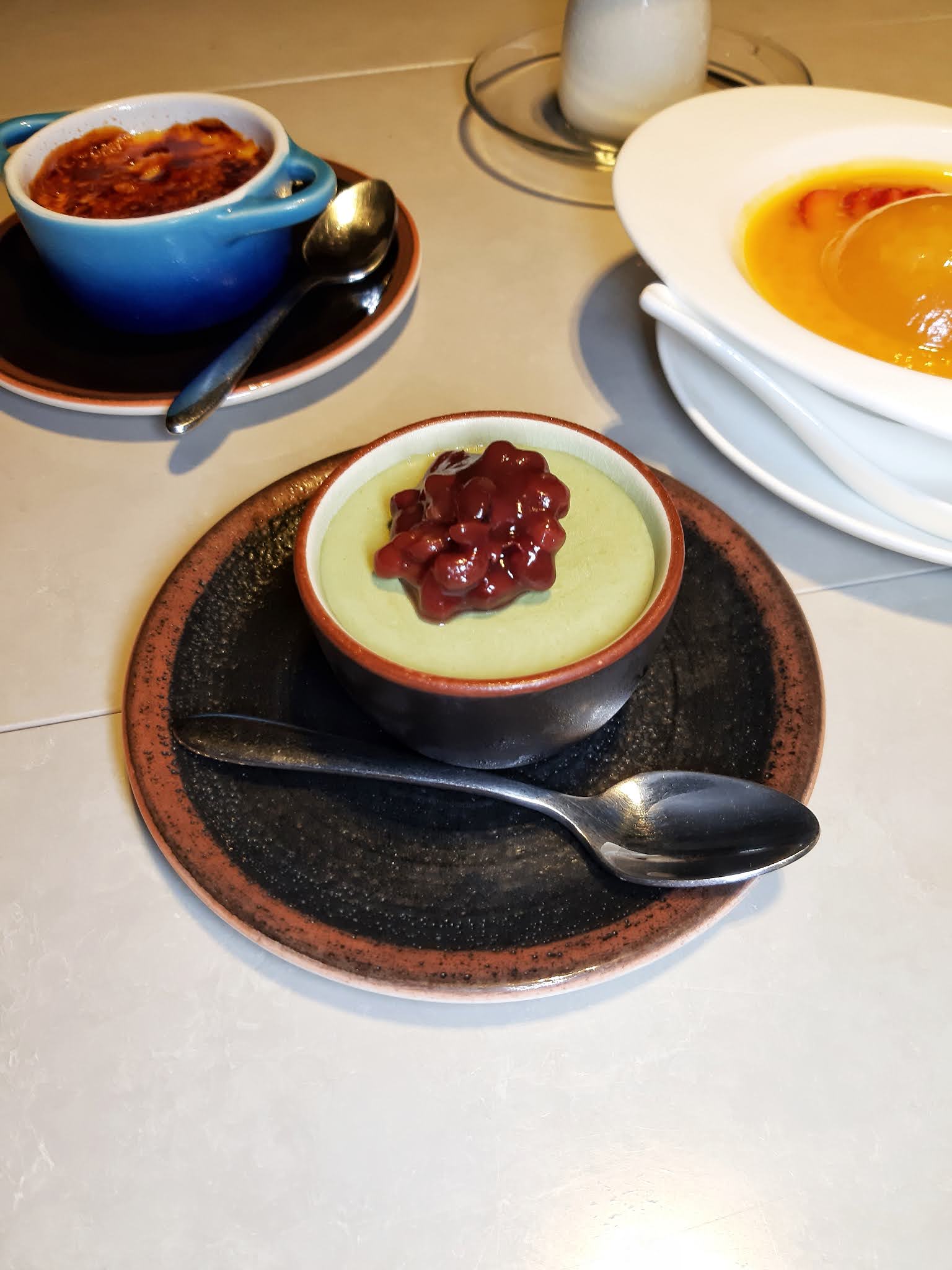 一口氣點齊木糠布甸、綠茶紅豆意大利白酒奶凍、焦糖燉蛋、芒果楊枝甘露水滴、芒果楊枝甘露黑白配及北海道3.6牛奶布甸,正好每人一款。