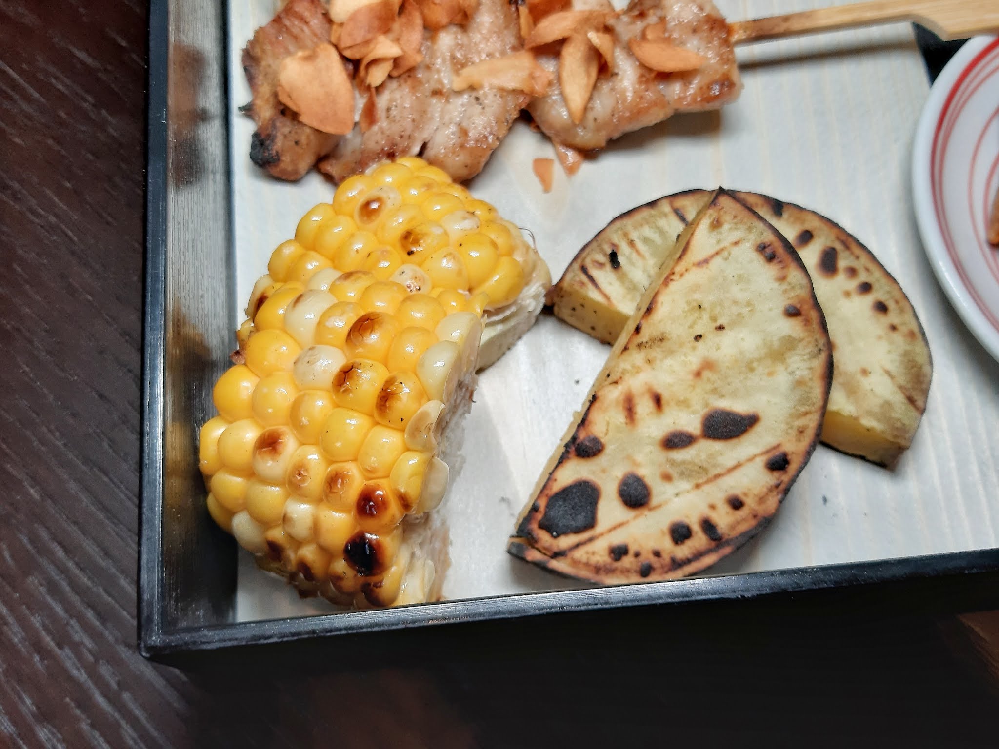 蒜片豬頸肉是另一道令人難以抗拒的美色,薄片豬頸肉烤得夠香,連同脆蒜片一齊食,只嫌一串未夠喉啊!