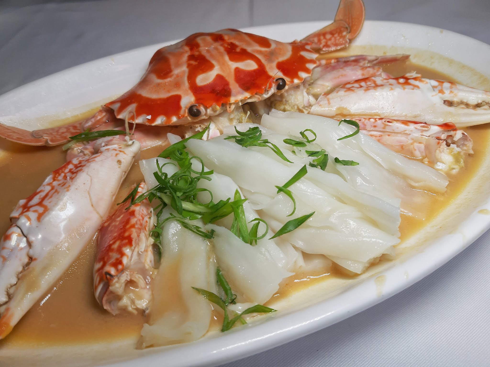 Steamed Fresh Flowery Crab with Aged ShaoXing Wine, Fragrant Chicken Oil & Flat Rice Noodles
