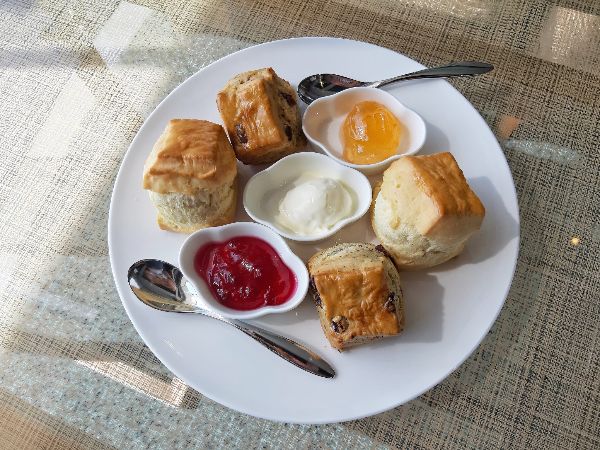 三層架最底層是(Plain and Earl Grey Tea Raisin Scone)(served with Clotted Cream, Strawberry Jam. Apricot Jam)原味及伯爵茶提子鬆餅配奶油忌廉,士多啤梨及否脯醬,咬落幾鬆化,而且有三種口味的醬料供選擇,個人就喜歡 Clotted