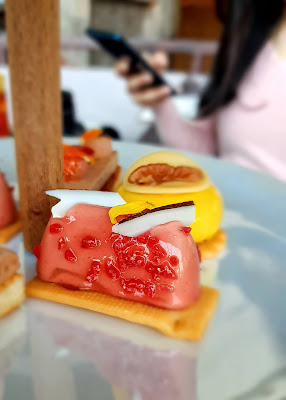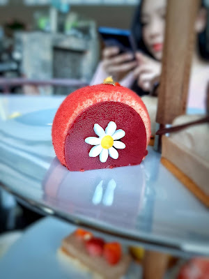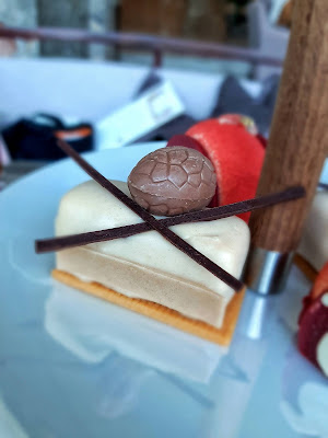 兩片紅桑子片上的白朱古力兔,帶出了「復活節」的氣息;糖漬紅桑子慕絲及荔枝吉士忌廉幼滑如絲,泡沫咖啡蛋糕令口感不會單調,相信好難擋得了的誘惑。