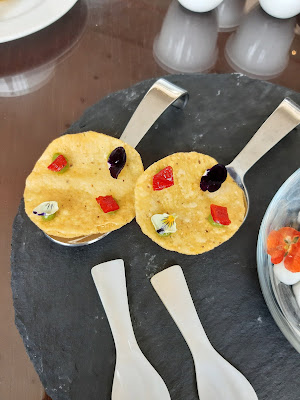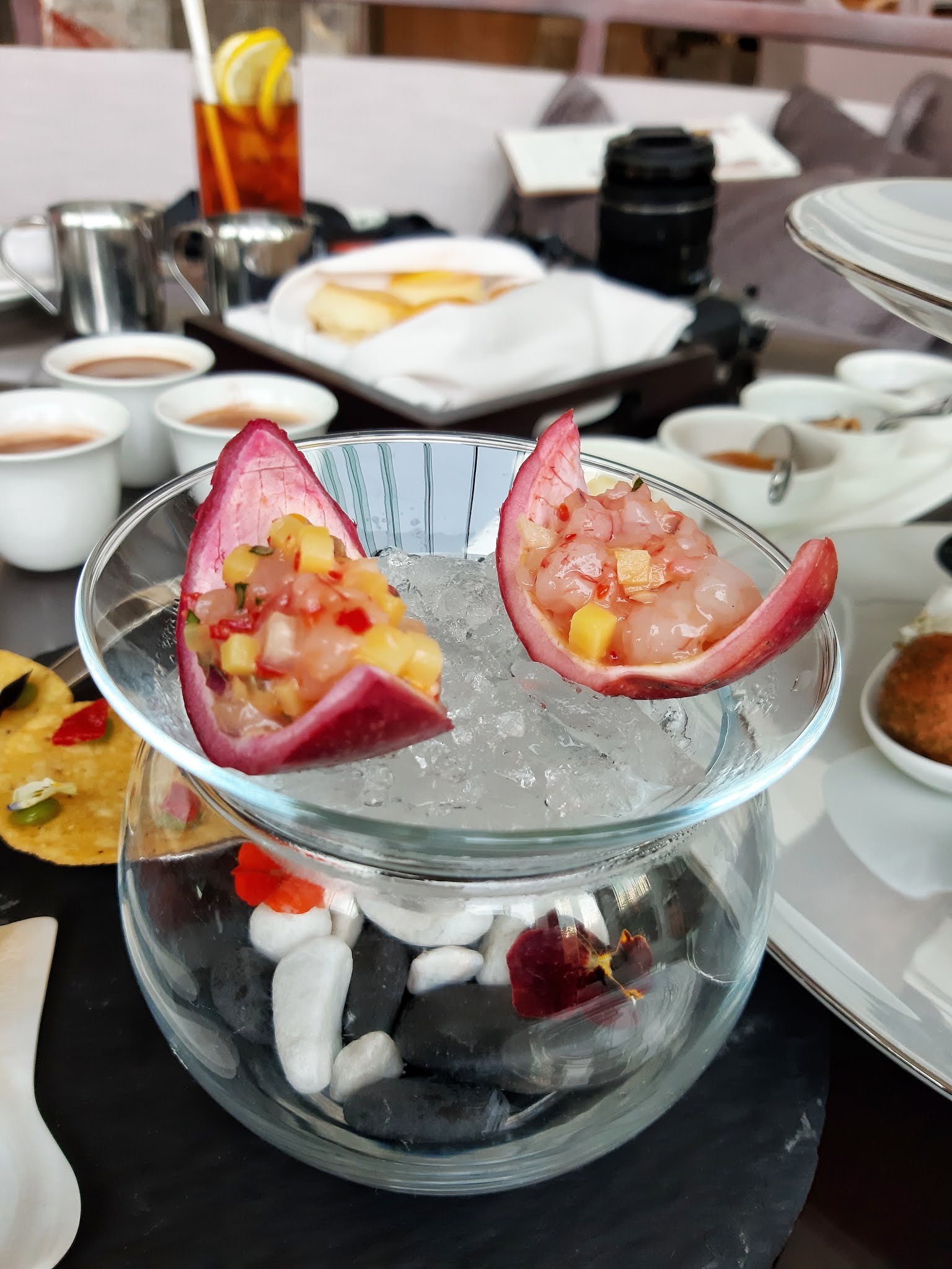 剖開的新鮮熱情果,拌和碎上的酸醃西西里紅蝦,再放在西班牙紅椒墨西哥餅上,口感層次分明又複雜。