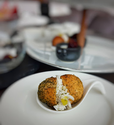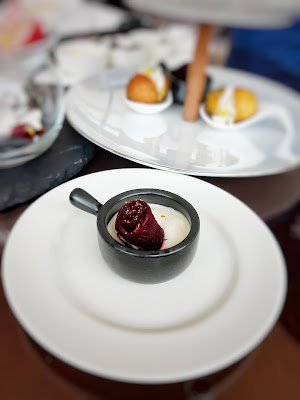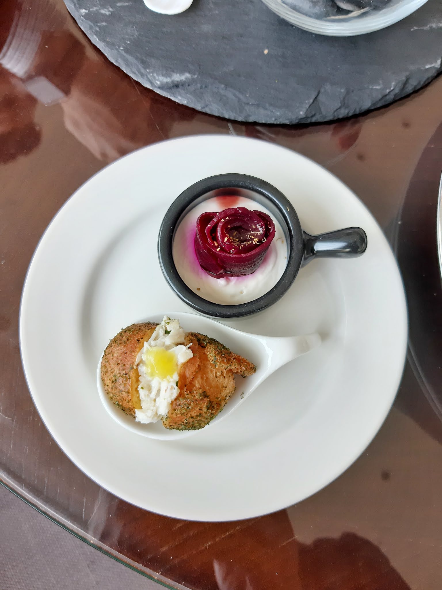 把紅菜頭卷成豔紅的玫瑰花,放在法國軟芝士上,紅白對襯的色彩真好看,澆上少許紅桑子黑醋汁,酸甜夾雜,令人不會覺得過於甜膩。