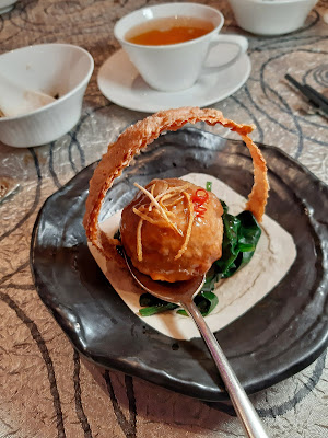 把手是芋片,獅子頭是芋茸,內裡餡料是什菌、豆腐、蓮藕及香菇,搓成圓球後,先炸過再燴,薄薄的一層玻璃芡更得我心。