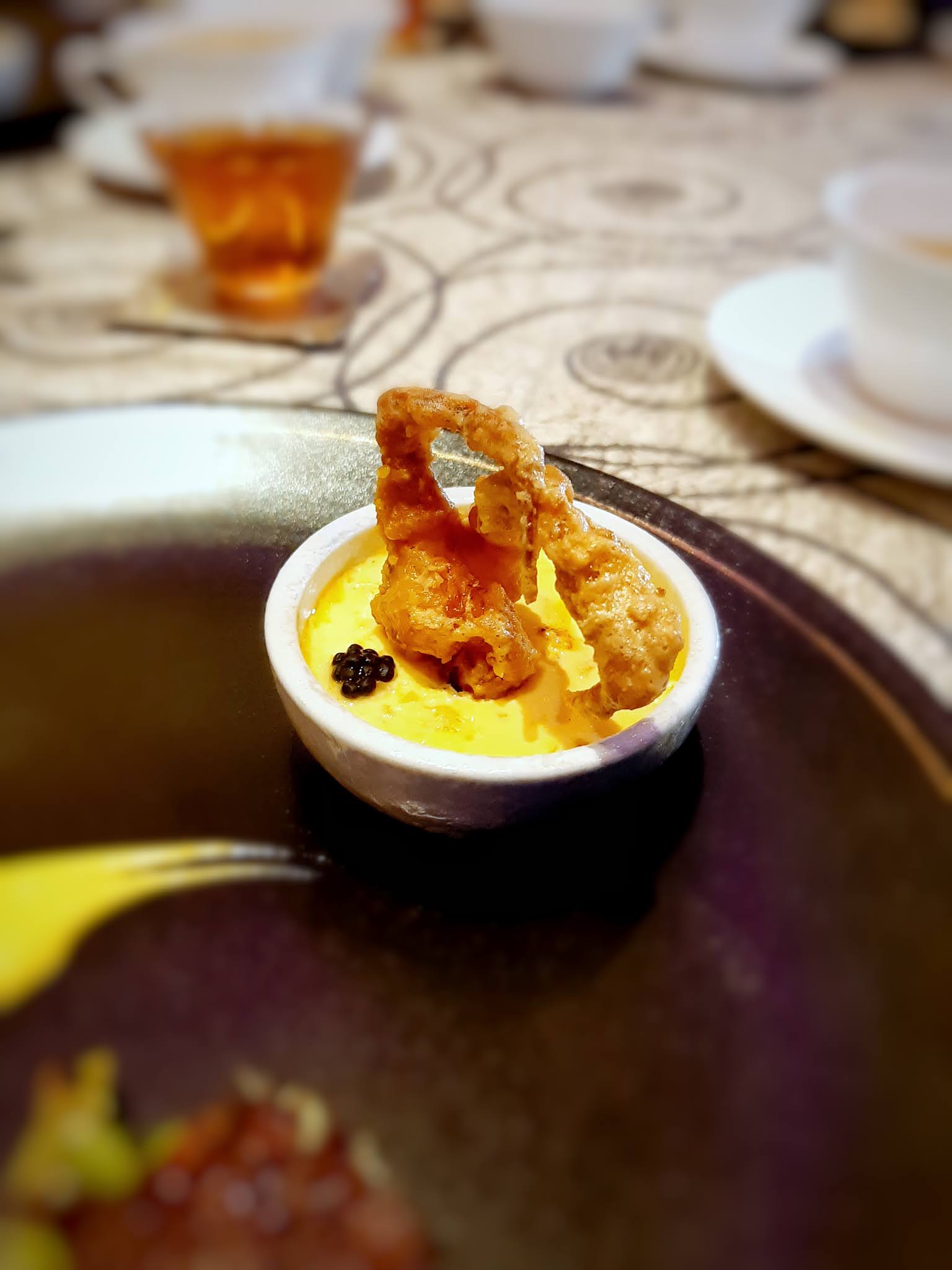 炸得香脆的軟殼蟹,驟眼看又幾似一道金鎖,然而卻鎖不住美味,置底的茶碗蒸,鮮甜味美,兩種不同質感的組合,構成獨特的畫面。