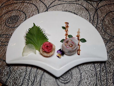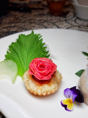 蘋果片以砌成玫瑰花,形神俱佳,餡料帶少許麻辣,有若美麗綻放的玫瑰花,豔麗中蘊含另一面,要小心處理啊!