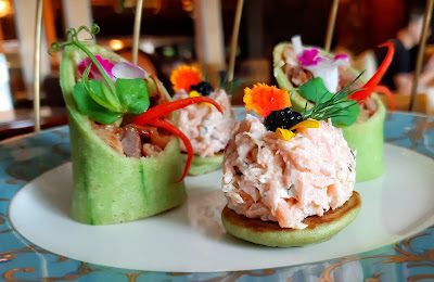 Slow-cooked salmon rillettes with caviar and matcha pancake