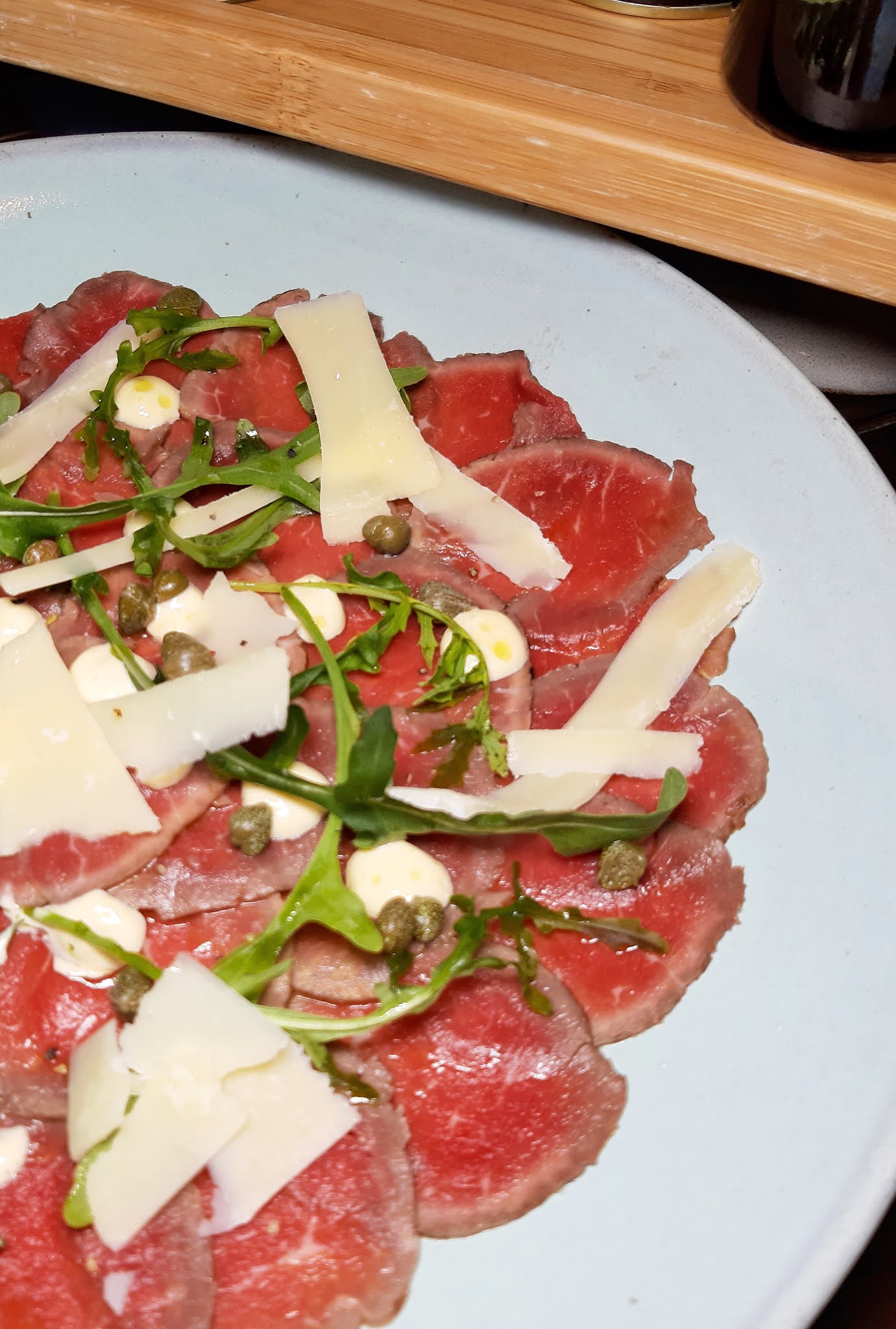 肉質呈嫣紅色,質地幼嫩,配士巴馬芝士及火箭菜,口感清新豐腴。