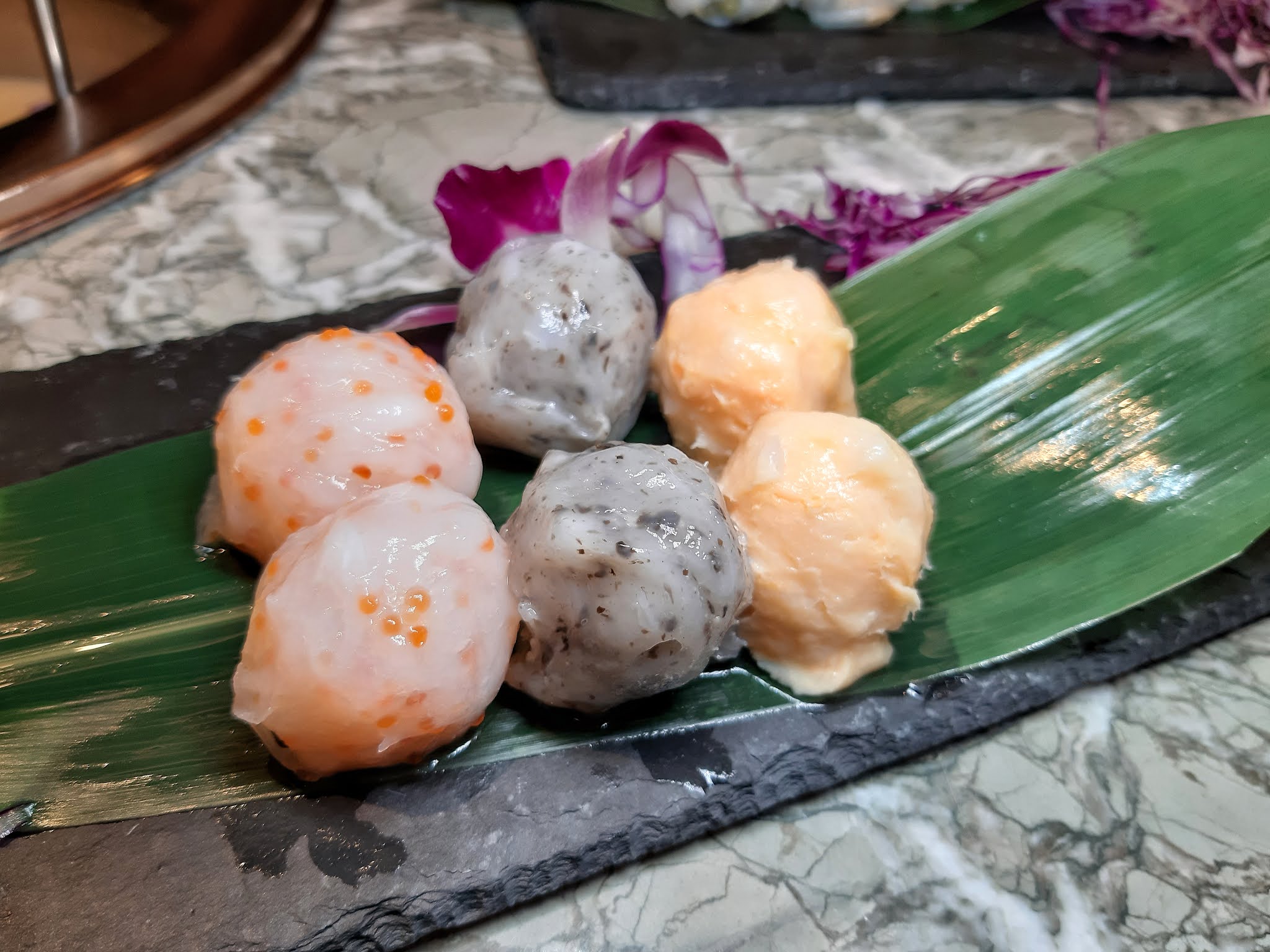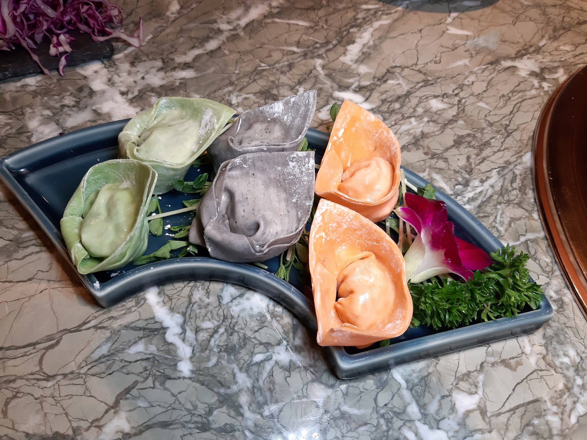 有黑松露長腳蟹餃(黑)、芝士鮮菌餃(橙)及野生松茸餃(綠)。