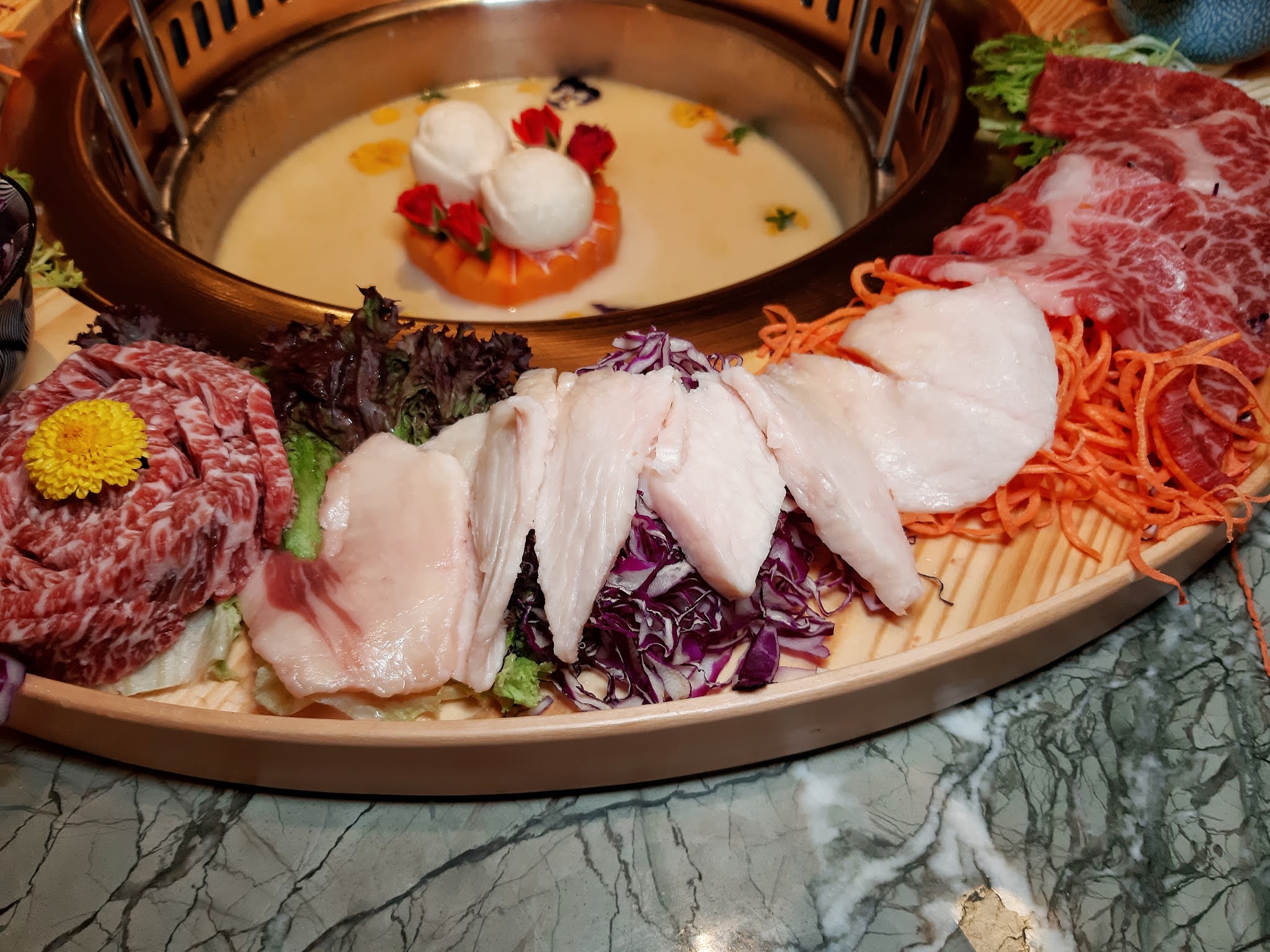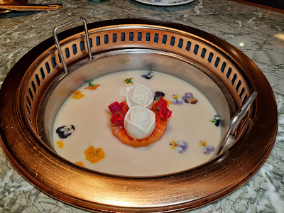放上兩朶用日本牛乳雪成的白玫瑰花,又係一個影相位,睇住花朶慢慢溶化,下邊是木瓜肉,難怪湯底咁甜。