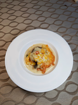 本身帶有好濃烈既西餐色彩,班球肉厚,煎得啱啱好,炸過既芝士片亦好脆口,但忌廉汁似乎過多,可能想加入中菜元素,置底是糯米飯,但吸了忌廉汁後變得有點膩,或者改用蘆筍西蘭花之類菜蔬會更合適。