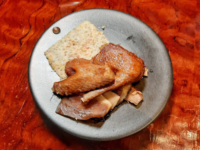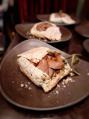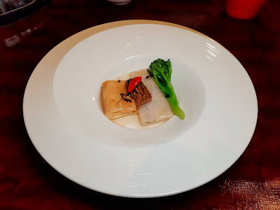 大廚選用了頂鴿,加入先蒸過的雲南大頭菜,以鮑汁扣過的紅菜頭片及日本花菇,裹上荷葉及酥皮再烤焗,鴿肉不單保持了嫩滑的質感,更加吸收了花菇的香味,創意得來又美味,個人覺得係全晚最佳菜色。