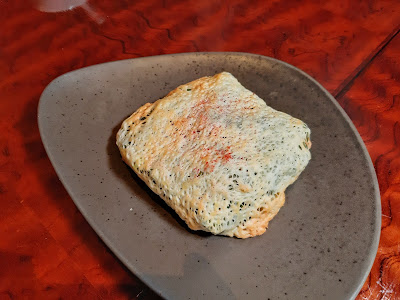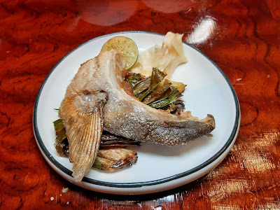 至於「香蔥烤油甘魚鮫」是以蔥段包裹魚鮫煎煮,把蔥香逼入魚肉,然後以竹篾綑綁再烤焗,其實整條魚最嫩滑的地方是魚鮫下邊的一小片魚肉,師傅處理得宜,沒有浪費了好食材,入口盡是魚油及蔥香,就連蔥段都變得好惹味。