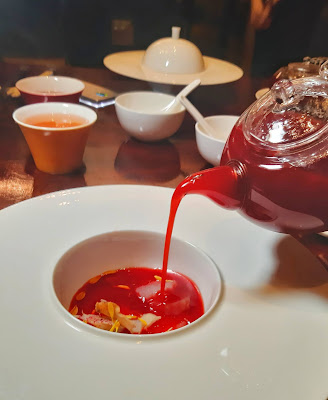 這個「螺片白肉紅菜湯」真的見功夫,以高湯及螺頭湯加上紅菜頭,望落色彩絢麗,由於紅菜頭是預先蒸熟,所以青草味亦已消失,反而多了一份甜美,湯碟放上螺片、菊花、杞子、蘿蔔及紅菜頭,隨後把熱湯注上,賣相與食味同樣精彩。
