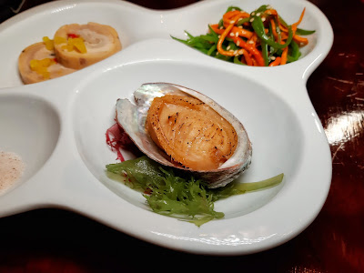 先試試以大連貨色炮製的「鹽焗鮮鮑魚」,內臟早已清除,令人食得安心,鮑魚咬落煙韌彈牙,蘸點些少淮鹽,味道更可口。