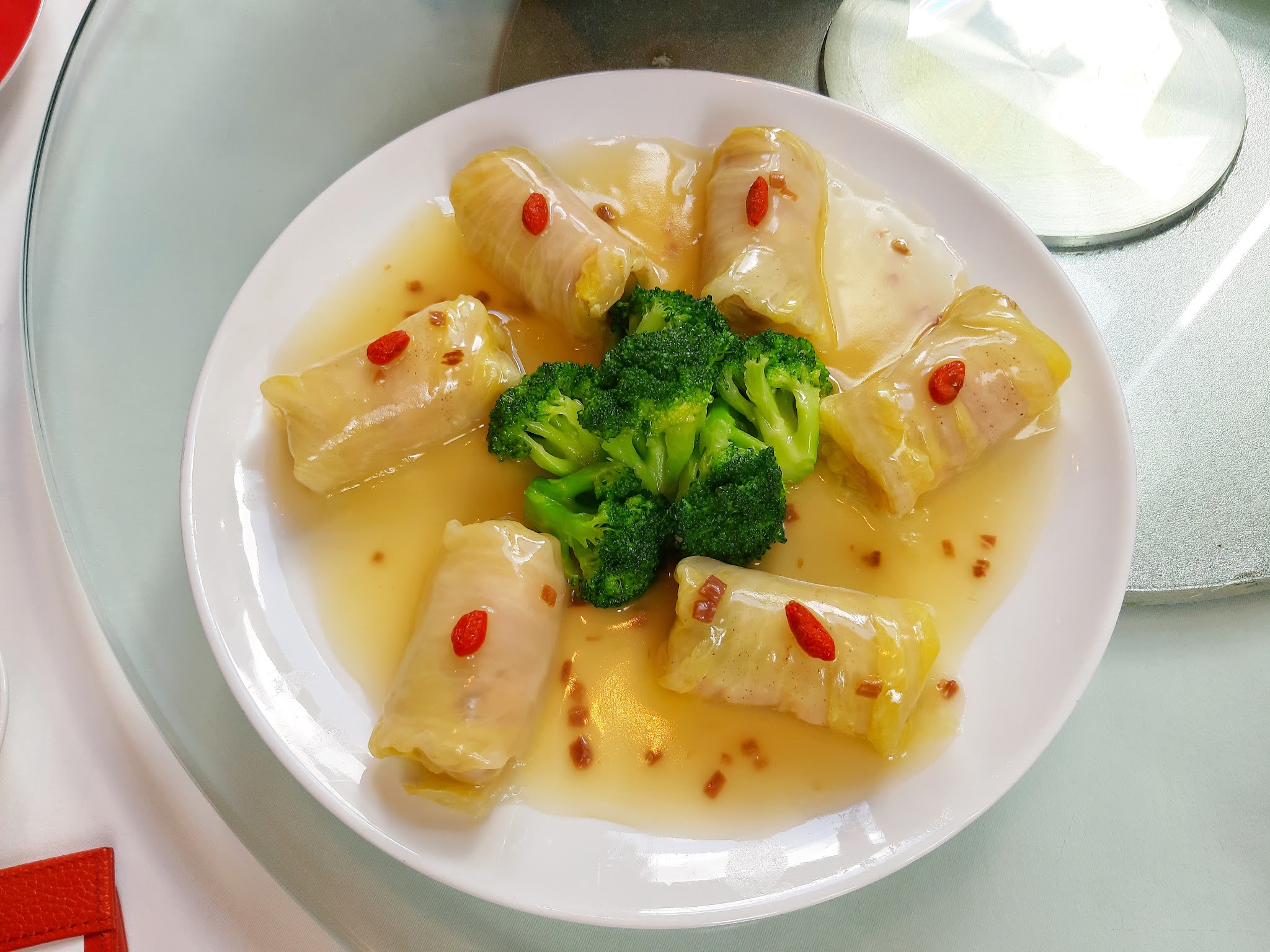 其實潮州菜都可以見功夫及心思,原以為是以煮至軟身的津白包裹著豬肉條,但細心一看,卻是加入了金華火腿、蝦膠及蘿蔔,難怪味道複雜,澆上薄薄一層玻璃芡,除了令菜色多了一份滑溜外,更有些少保溫作用,真是色香味俱全。