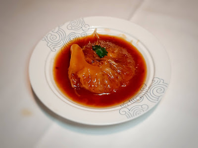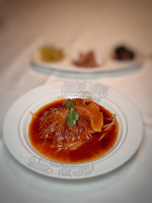其實係排翅,翅針緊連著骨膜,呈亮麗的扇狀,泡發處理得宜,汁液以老雞及金華火腿熬煮而成,芡汁恰到好處,翅針蘸滿了精華,份外覺得矜貴。