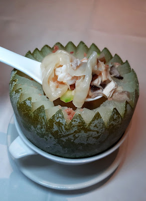 原個迷你冬瓜剖開,內裡湯料有花膠、瑤柱、蝦仁及火腿,喝完湯仲可以挖開冬瓜肉食,在炎夏中最啱的湯水。
