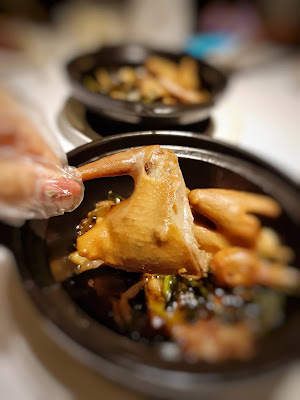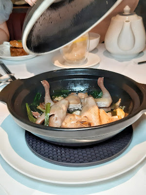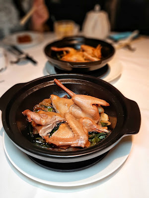 原砂鍋上檯,一揭蓋已瀰漫陣陣蔥香,乳鴿先炸後焗,肉質細緻嫩滑,就連鴿骨都帶香氣,置底的三蔥不是台灣「三星蔥」,而是洋蔥、蔥段及蔥頭,鴿汁與蔥香混成一體,蔥頭煮至軟腍入味,正。
