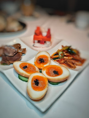作為餐廳的招牌菜之一,「黑松露珍珠燻溏心蛋」以高郵鴨蛋製成溏心蛋,再以龍井茶葉煙燻,令整隻蛋都是煙燻香氣,加上蛋黃呈溏心的確令賣相更亮麗,放上意大利黑松露珍珠。