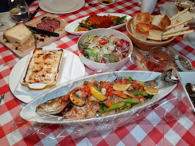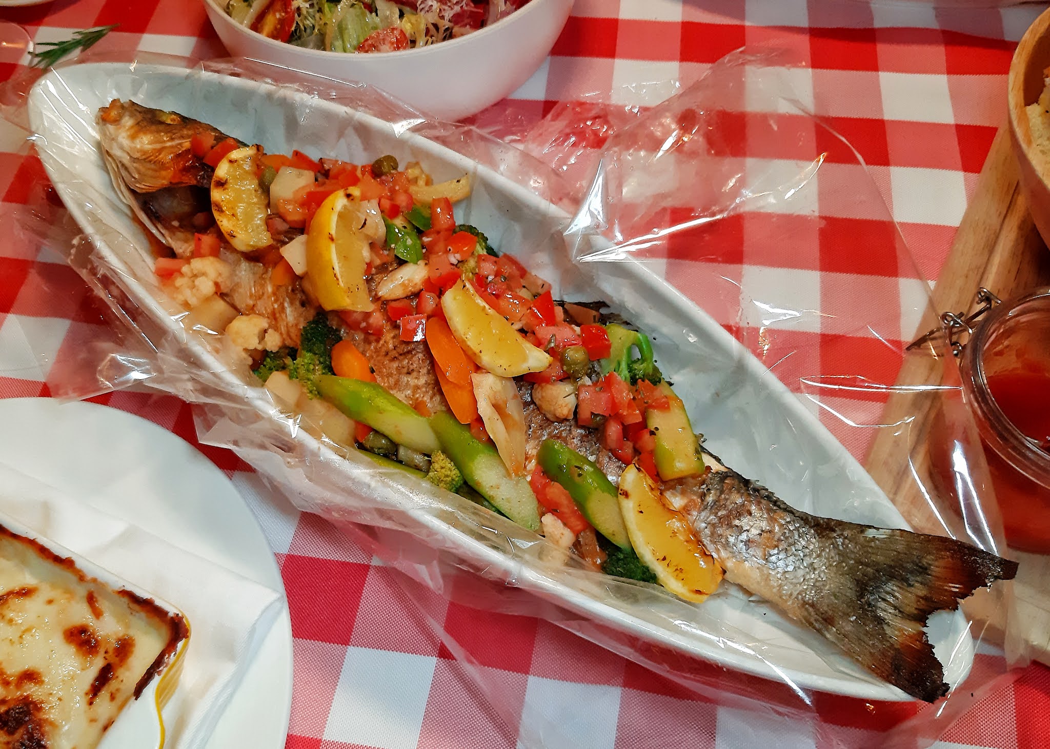 原條鱸魚上檯,烤焗得啱啱好,魚肉嫩滑細緻,魚皮尤其香口,一點腥味都不覺有,配菜極多,露筍、西蘭花、椰菜花、蕃茄、薯仔、甘筍及香橙,把整條魚包裹住,講真,單係享用呢條魚加埋羊膝,已經半飽了。