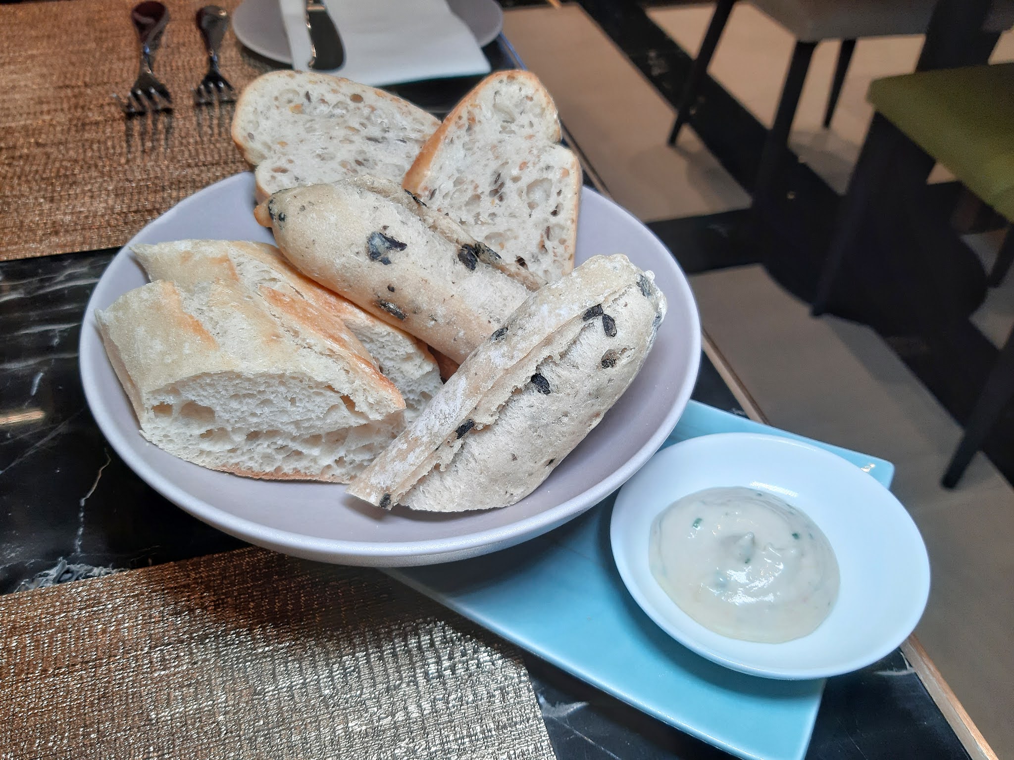 送上的麵包籃有法包及橄欖,塗上了鯷魚醬更覺可口。