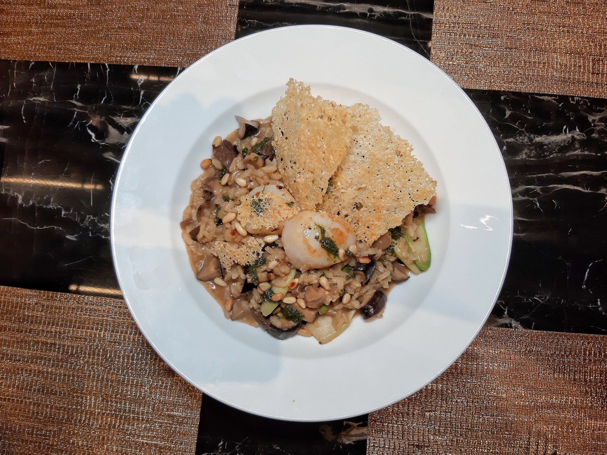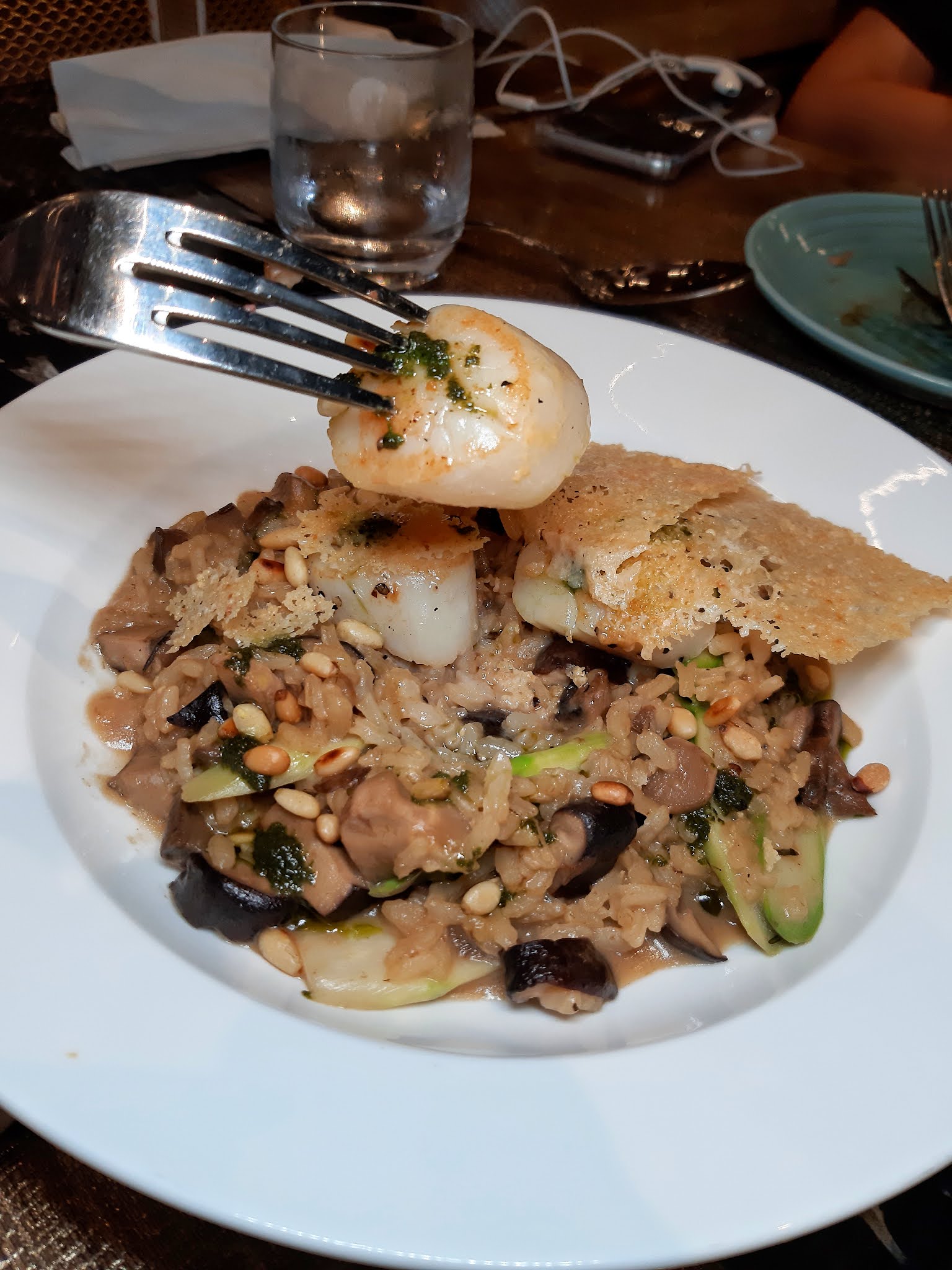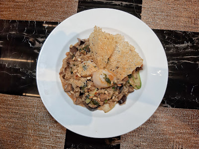 三隻大帶子略煎兩邊,飯粒加份了松子及蘑菇,口感豐富,放上兩片炸過的芝士片,進食前舂碎混和在飯粒中,令味道更