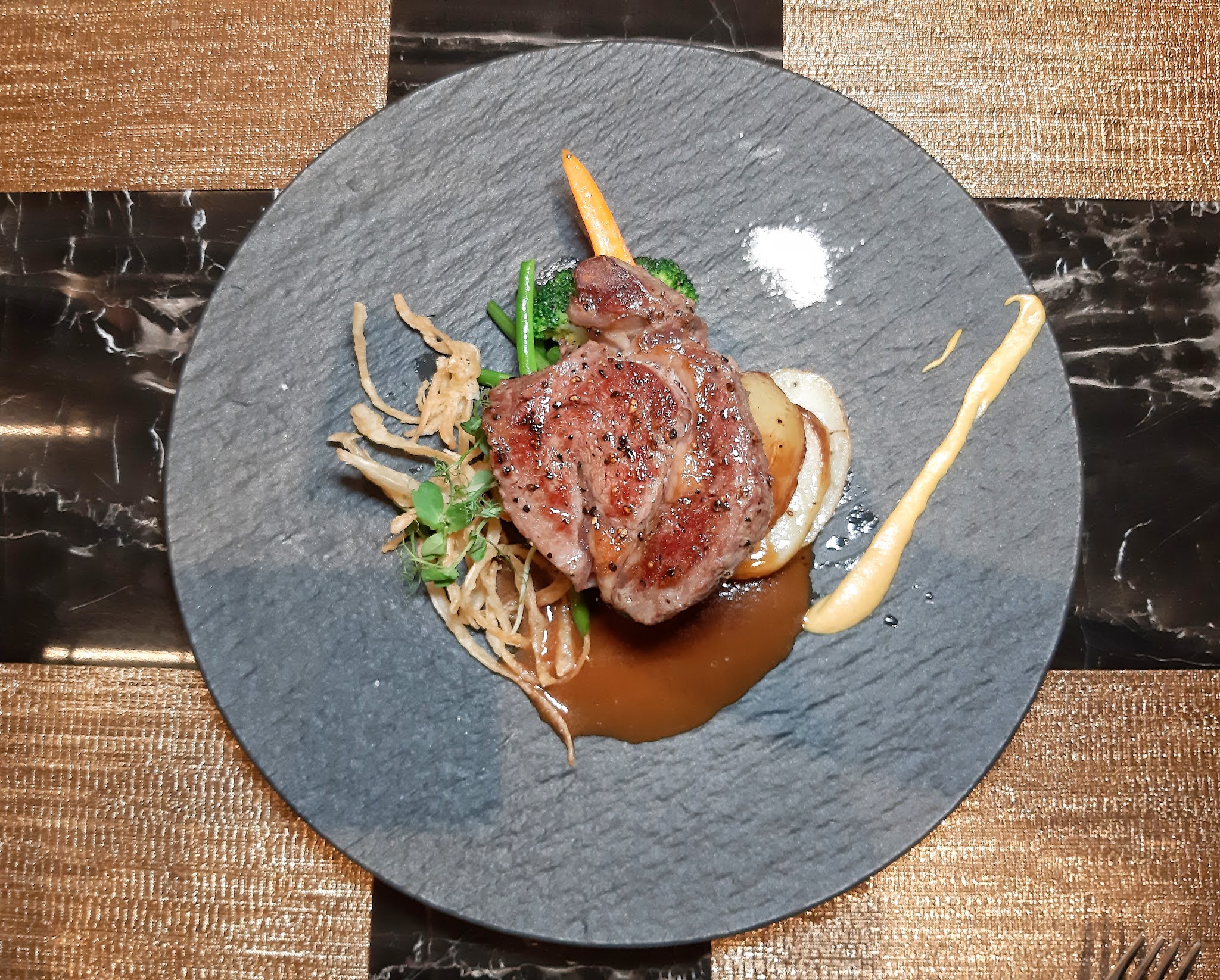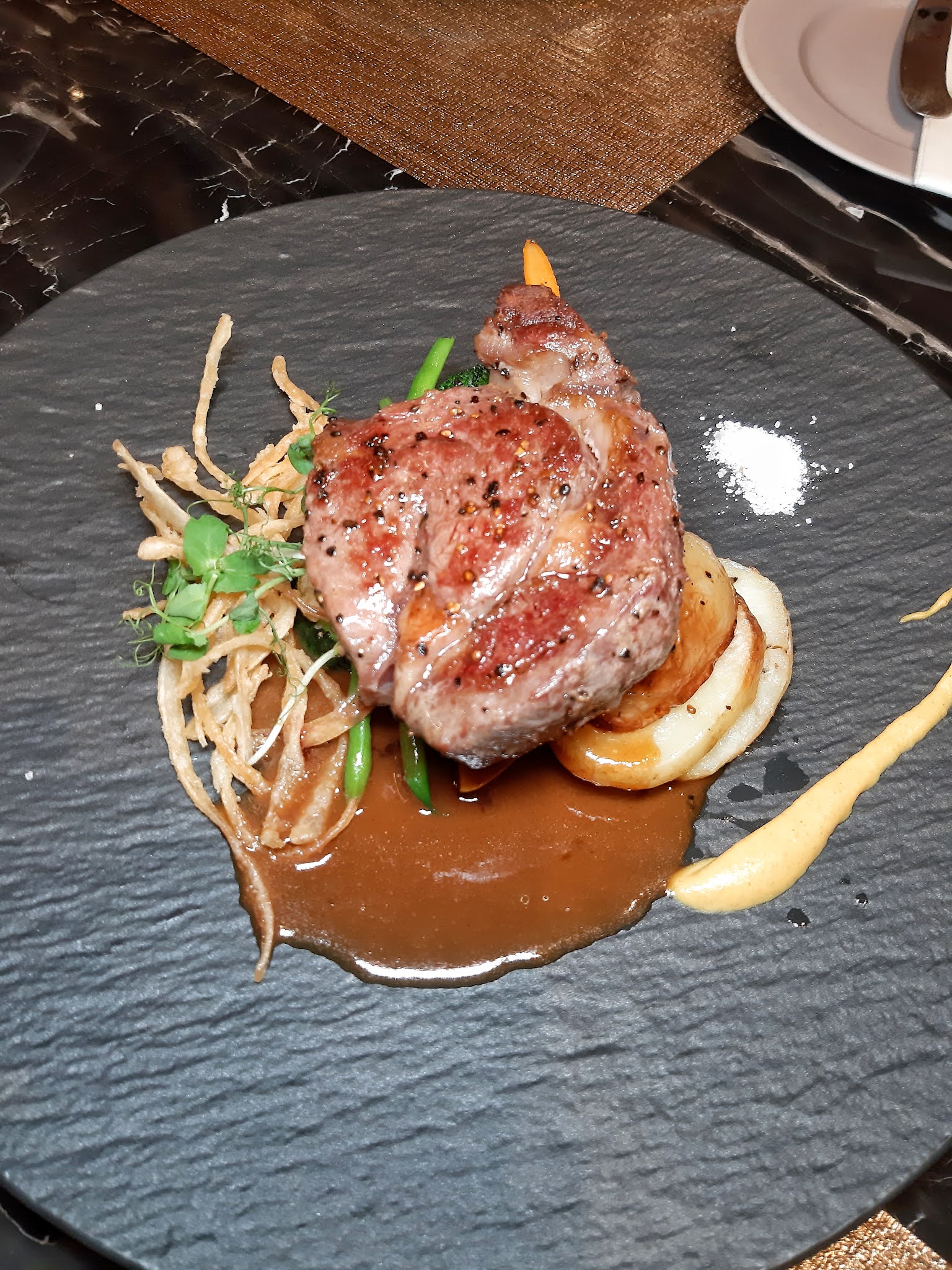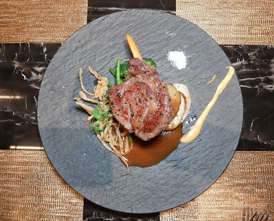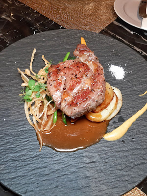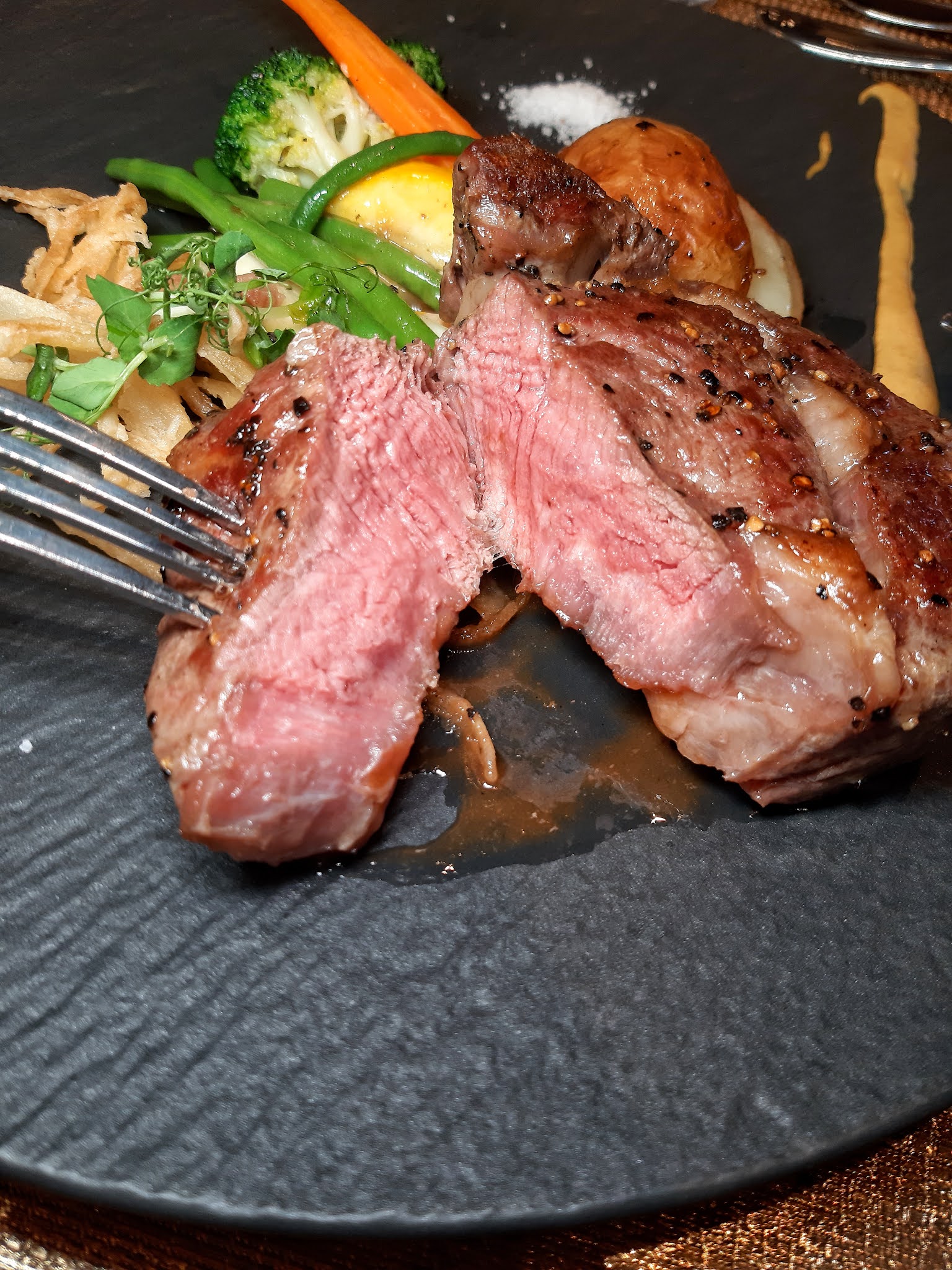 畢竟近日巴西牛出事,選用澳洲肉眼正好避免尷尬,Medium 處理得相當好,芥末及海鹽伴碟更見細心,置底的菜蔬有甘筍、西蘭花、邊豆、露筍及 zucchini,非常豐富又健康。